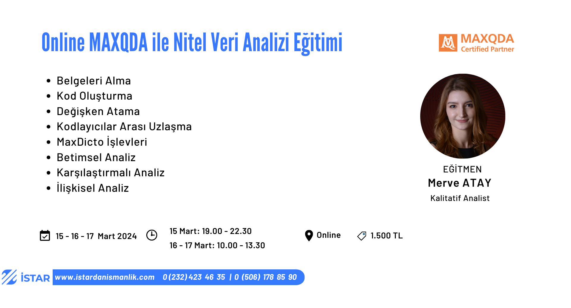 Online MAXQDA ile Nitel Veri Analizi Eğitimi (15 - 16 - 17 Mart 2024) 19.00 - 22.30 Online 2024-03-15 Belgeleri Alma Kod Oluşturma Değişken Atama Kodlayıcılar Arası Uzlaşma MaxDicto İşlevleri Betimsel Analiz Karşılaştırmalı Analiz İlişkisel Analiz